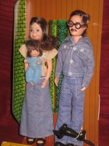 The S. S. Kresge Springtime Family Dolls 1975 made in Hong Kong are clones of Mattel’s Sunshine Family Dolls. The set consists of a Mom, a Dad, a baby, and a dachshund. They are traveling and living off the land because they may be homeless. They are selling apple’s outside of the yellow hippy type rv or bus camper. The Springtime Family makes me think of the 1971 song Me and You and a Dog Named Bo.