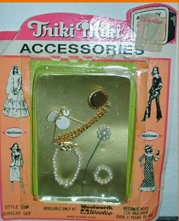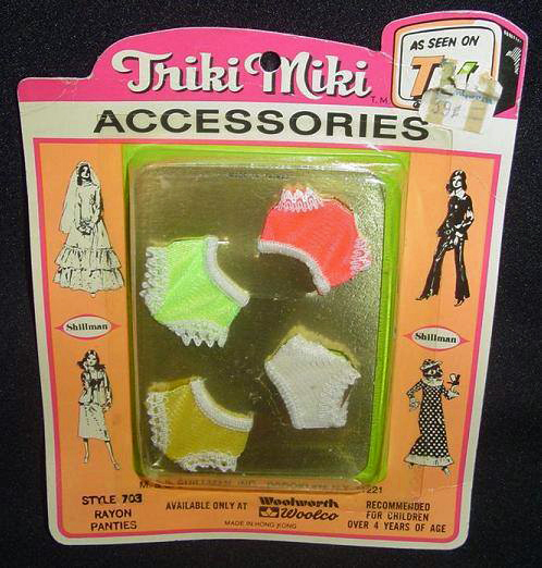 Triki Miki had a large number of outfits that were sold separately, and also shoes and jewelry. Shillman made these outfits. There must have been an agreement between the two companies. Triki had a carrying case with room for a doll and some outfits. The case came in orange or in green. Triki came as a blond, with black hair or as redhead. The redhead is better looking doll.