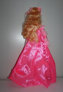 The dress on the smaller doll is not a pretty because it lacks the lace of the large sized doll. I really prefer the larger doll with her better looking face, but the small one is a pretty good second choice doll.